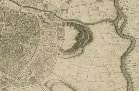 Plan restitué par Villaret, extrait de « l’Histoire de Montpellier » rédigée par le chanoine d’Aigrefeuille Le tertre de Saint-Denis, ainsi que Louise Guiraud le qualifie, formait une avancée qui régnait sur le faubourg du Pila Saint-Gély ainsi que sur la plaine du Lez, où plus tard sera installé le polygone militaire. Son extrémité orientale était toutefois isolée de la ville par la ligne de Palissade qui dans ce secteur avait été aménagée avant le milieu du 13ème siècle afin de répondre aux besoins de défense de ces faubourgs. Entre la Commune Clôture et cette ligne de palissade, à l’emplacement de l’Esplanade actuelle se développait le faubourg de Montpelliéret, formant la liaison entre la vieille ville et ce belvédère massif qui plus tard, sera utilisé pour former Plus au sud, s’étendait le faubourg de Lattes, qui permettait de relier par la porte du même nom, deux portalières qui ouvraient sur le riche terroir agricole du sud-est de Montpellier.